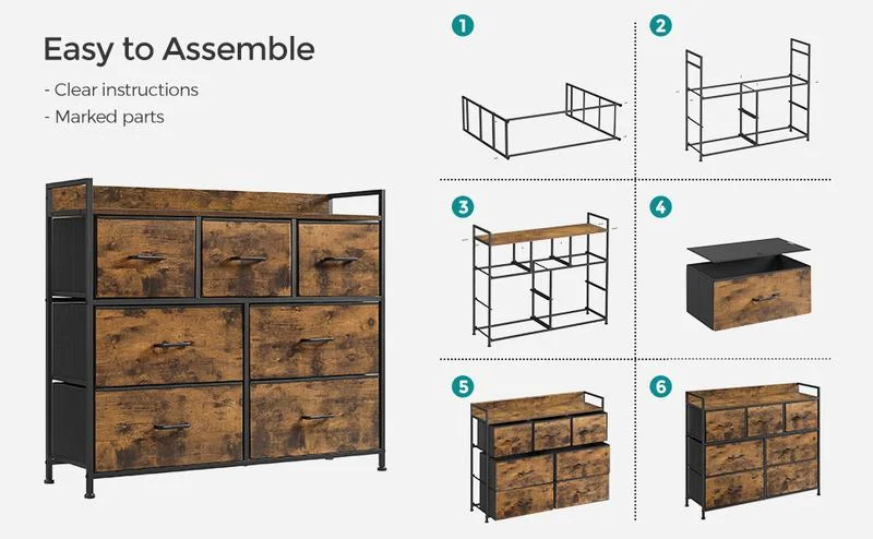 Komoda do przechowywania z 7 szufladami, zestawem akcesoriów i szczegółową instrukcją obsługi ułatwiającą montaż,
